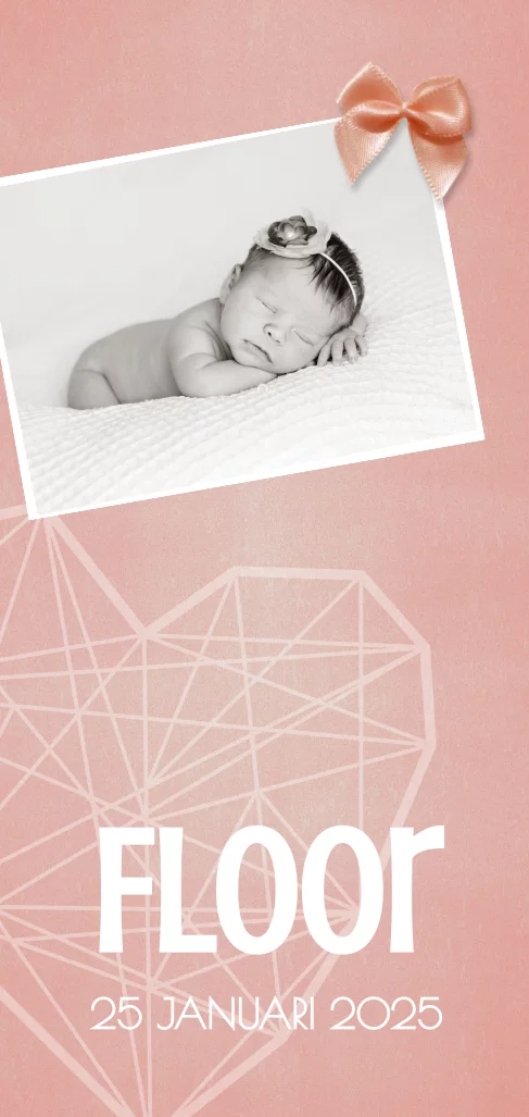 Grafisch roze geboortekaartje foto met echt strikje Floor