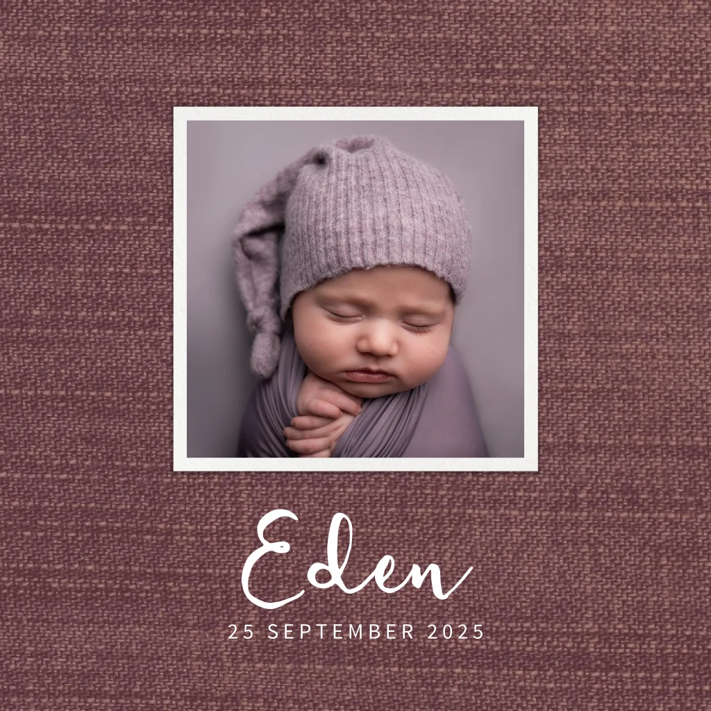 Hippe, uniseks geboortekaart met een foto van jullie kindje op een plum kleurige stoflook achtergrond. Het kaartje is eenvoudig aan te passen.