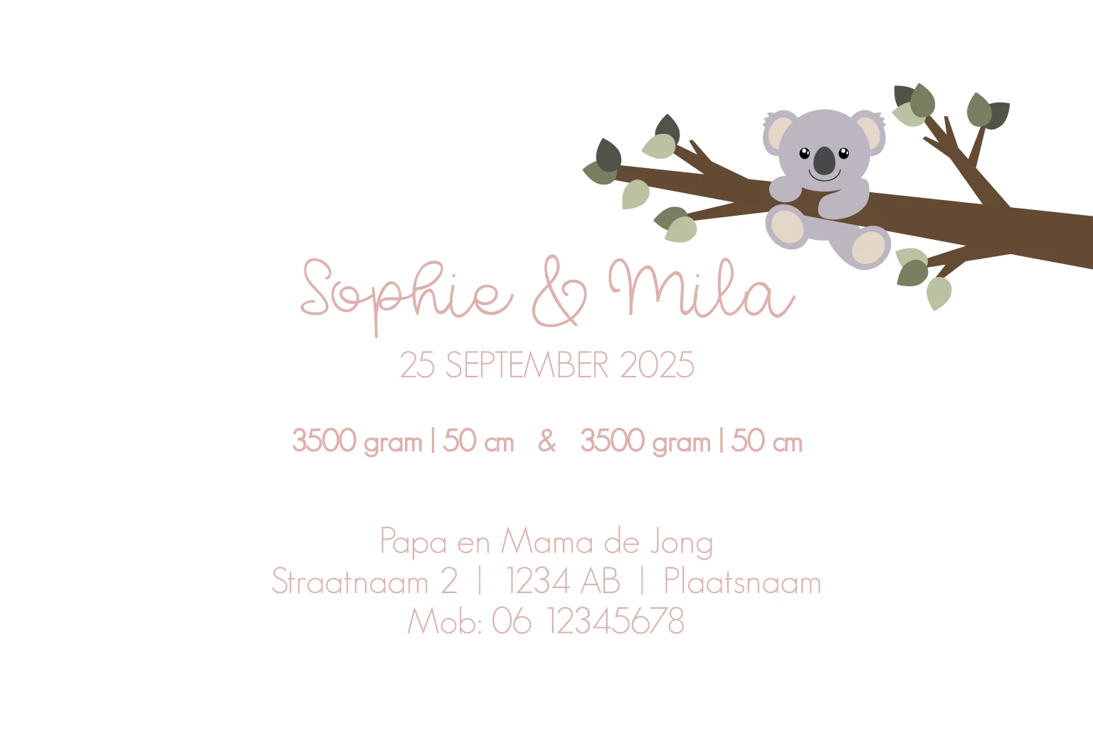 Maak de aankondiging van de geboorte van jullie tweeling meisjes extra speciaal met deze schattige geboortekaart. Met zijn witte achtergrond en een roze kader straalt de kaart zachtheid en tederheid uit. De lieve illustratie van koalabeertjes die aan takken met blaadjes hangen, voegt een vleugje speelsheid toe aan de aankondiging. Deze geboortekaart is volledig aanpasbaar naar jullie wensen, zodat jullie een unieke aankondiging kunnen maken die jullie geluk perfect weergeeft. Bovendien bieden we de mogelijkheid om een proefdruk te bestellen, zodat jullie zeker weten dat de kaart er precies zo uitziet als verwacht.