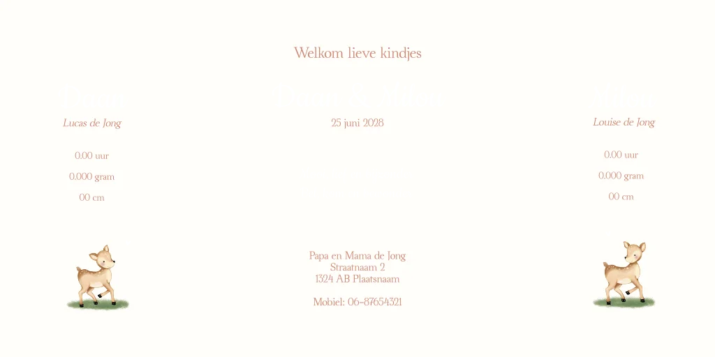 Aan de binnenzijde staan de namen in het midden. Links en rechts is ruimte voor de gegevens per kindje, zoals geboortedatum, tijd, gewicht en lengte.