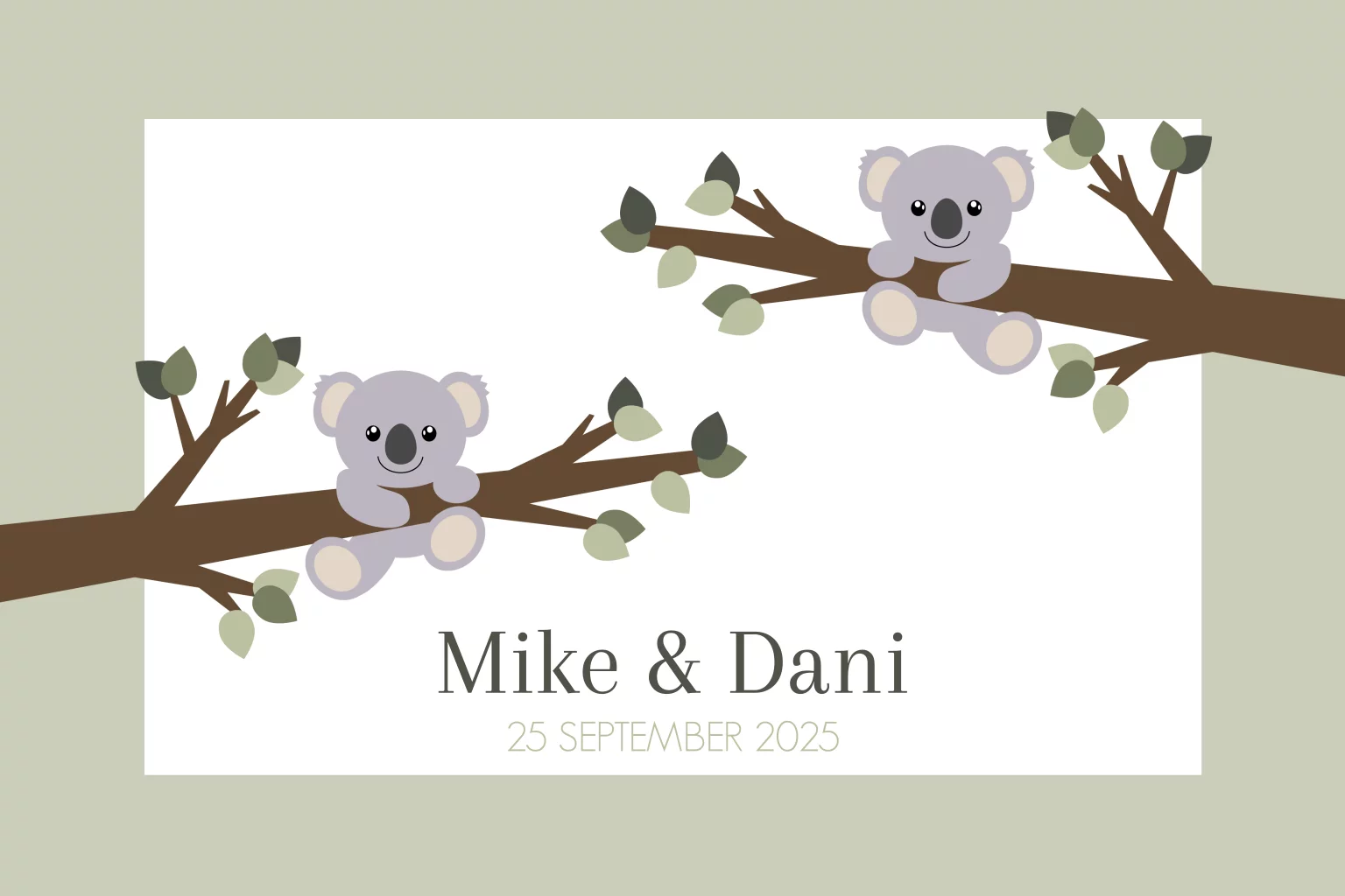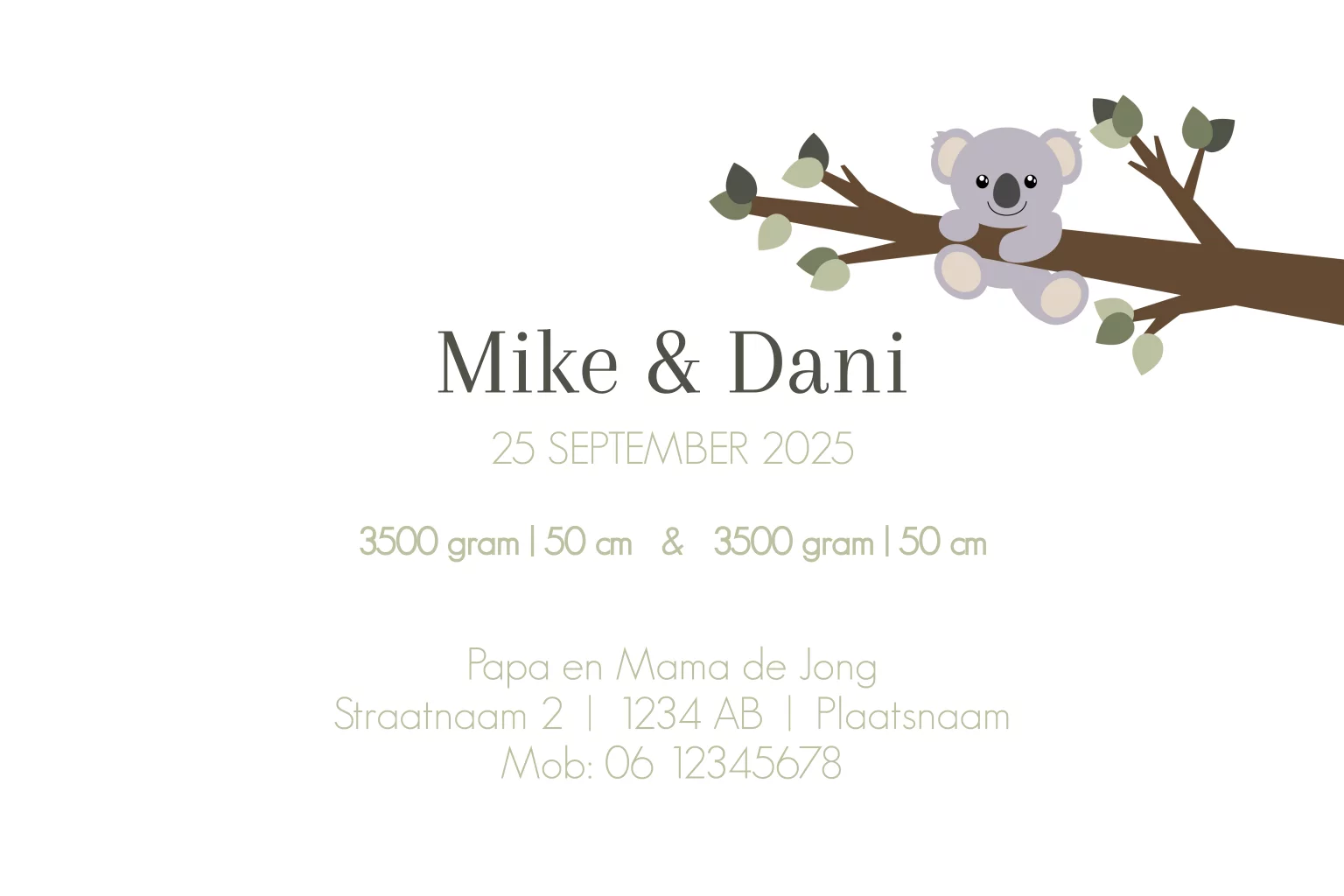 Maak de geboorte van je tweeling extra bijzonder met deze prachtige geboortekaart. De kaart heeft een witte met groene achtergrond en is versierd met een schattige illustratie van twee koalabeertjes hangend aan takken met blaadjes.