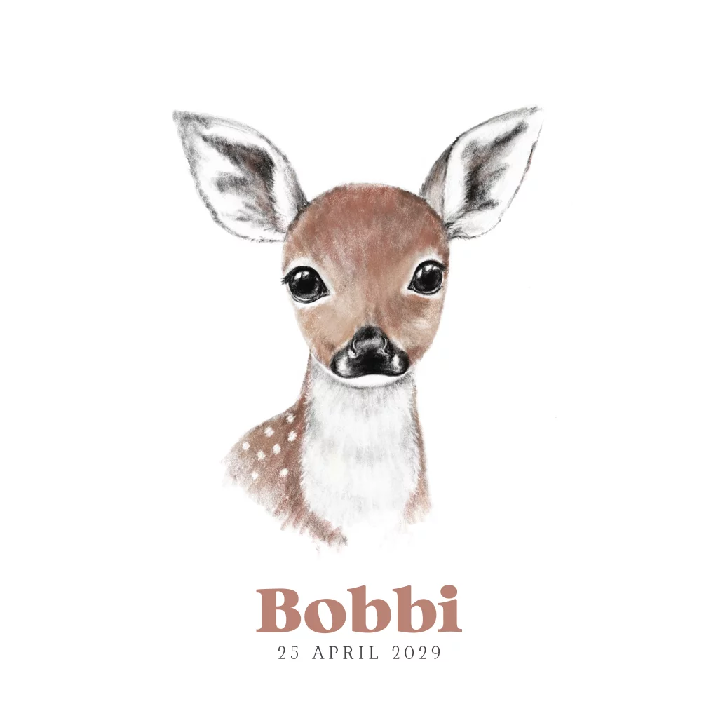 Bijzondere geboortekaart met een potloodtekening van een schattig baby hertje. Pas de geboortekaart naar wens aan en maak er zelf een unieke geboortekaart van voor jullie kindje. Deze unisex geboortekaart is perfect voor zowel jongens als meisjes.