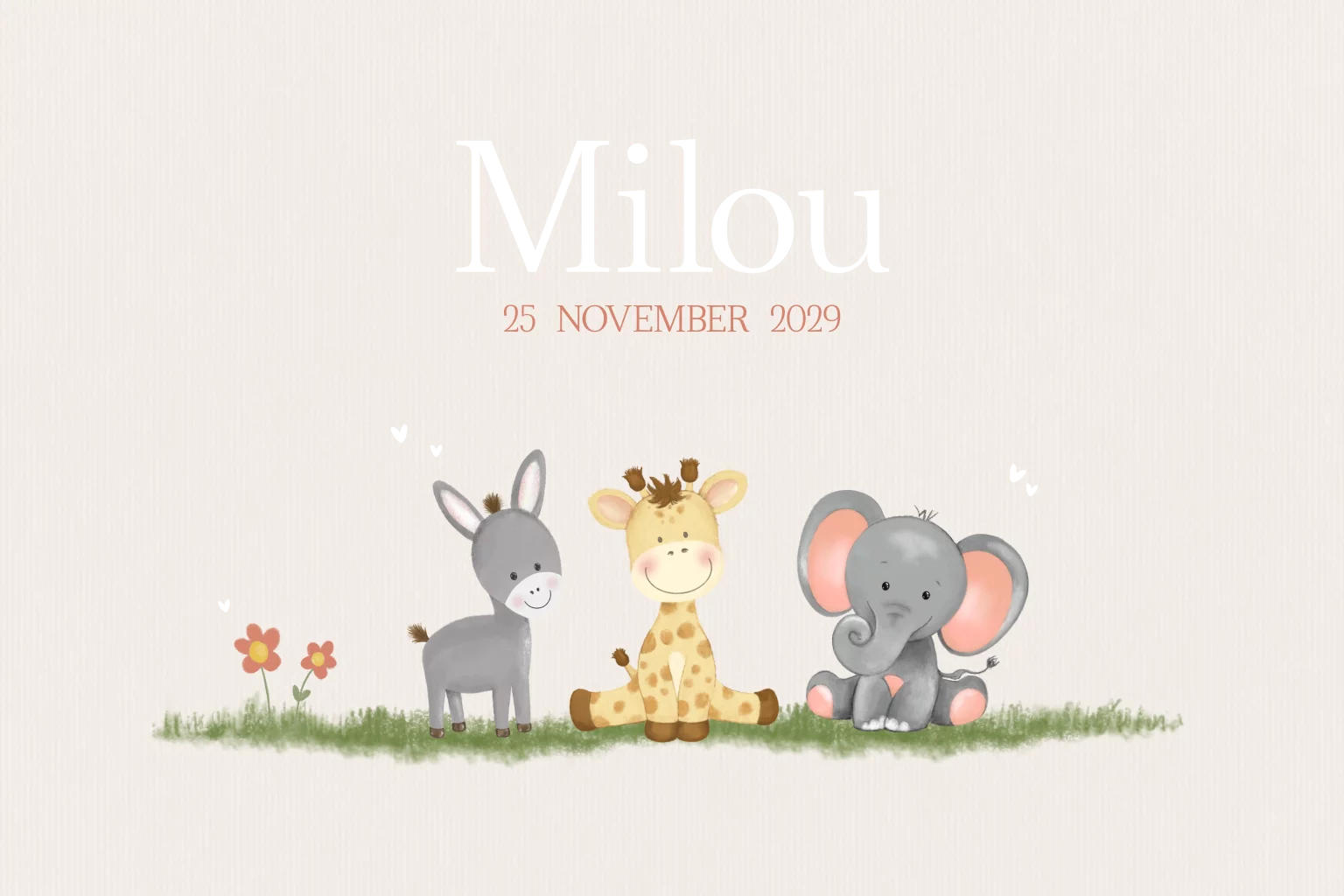 Maak kennis met geboortekaartje Milou – een vrolijke en stijlvolle kaart met een zachte zandkleurige achtergrond, drie lieve dierenvriendjes en de naam in luxe goudfolie. De combinatie van een girafje, ezeltje en olifantje zorgt voor een warme en speelse uitstraling, zonder dat het te druk wordt.