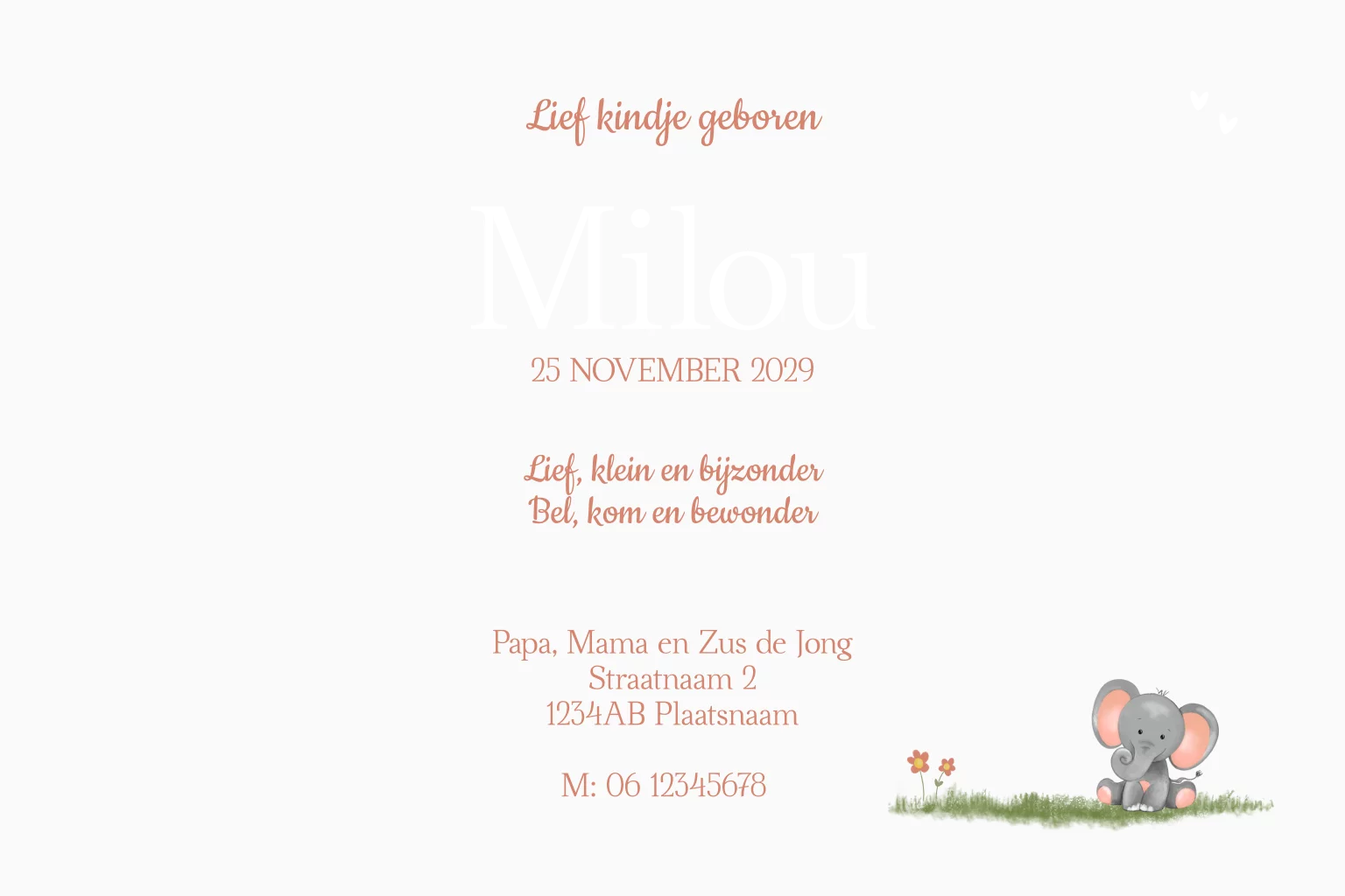 Perfect voor ouders die houden van schattig én rustig. De ronde hoeken en zachte tinten maken het geheel helemaal af. Dit ontwerp is onderdeel van de populaire dierenvriendjes collectie van Heidysign en is volledig naar wens aan te passen in de editor.