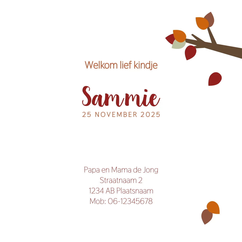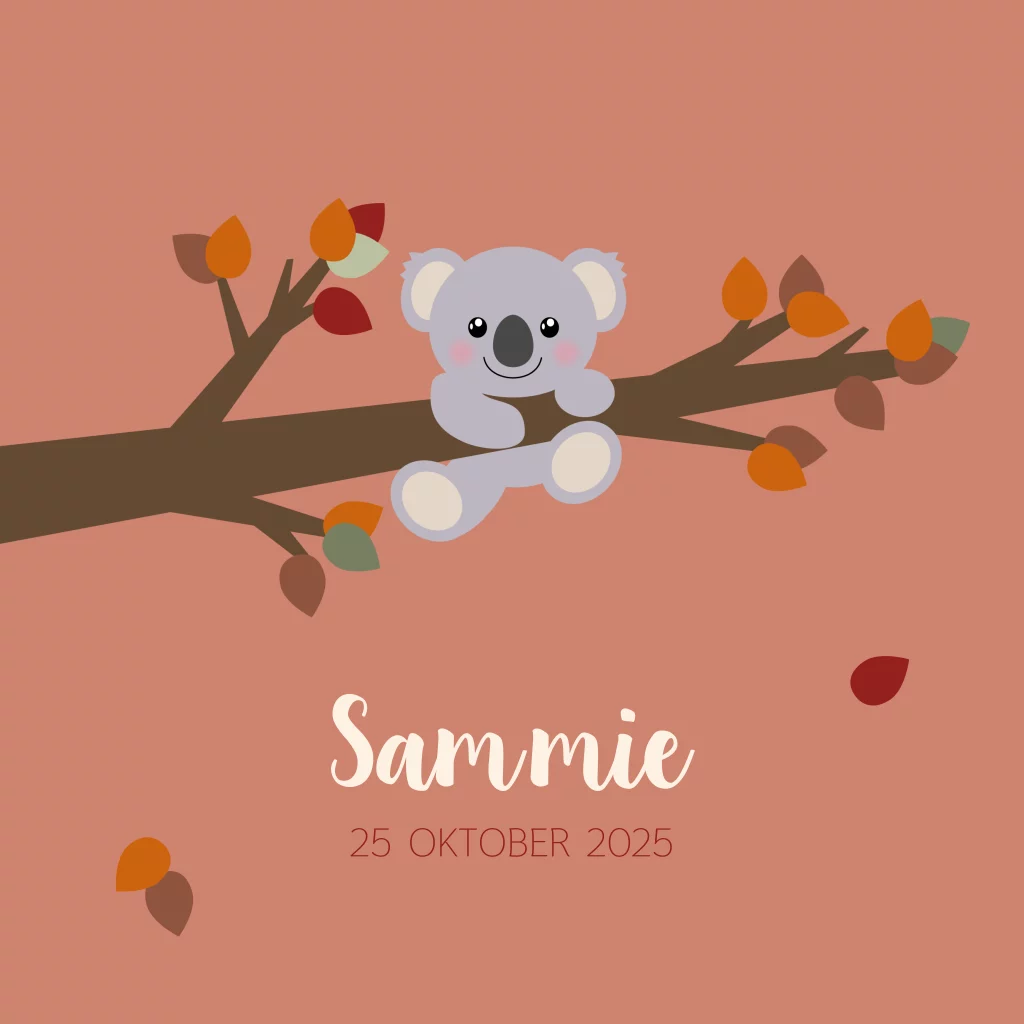 Geboortekaartje in mooie herfst kleuren. Dit schattige geboortekaartje heeft een illustratie van een lief koalabeertje, hangend aan een tak met blaadjes in herfstkleuren. Je kunt het kaartje eenvoudig aanpassen en er jullie unieke geboortekaart van maken.