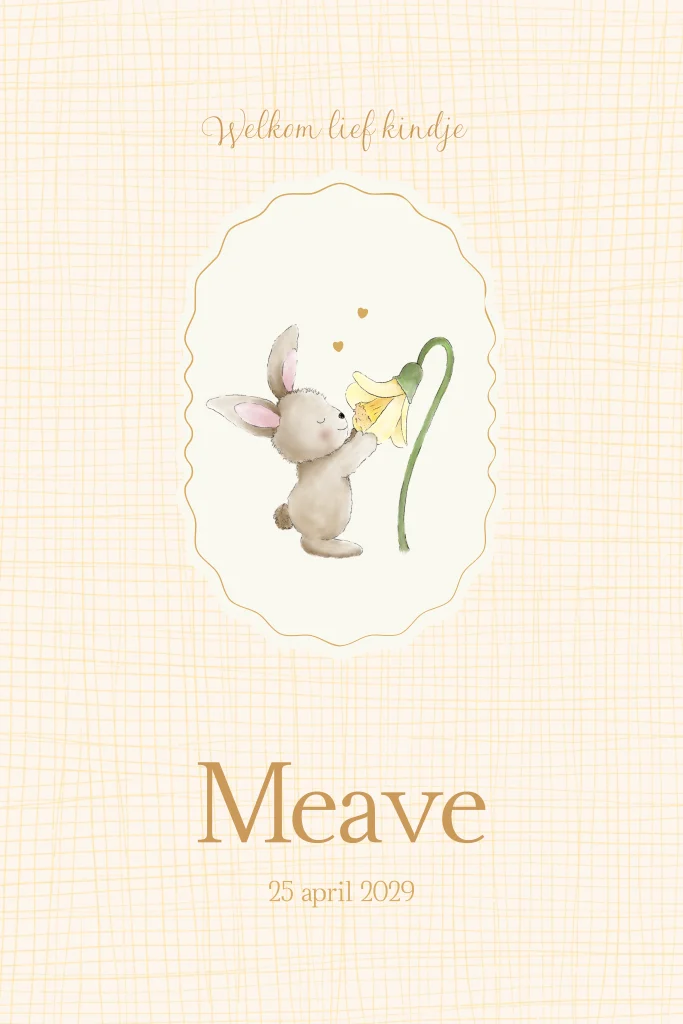 Een geboortekaartje met een konijntje en een narcis, op een zachte ruitjesachtergrond. Een klassiek ontwerp met een moderne twist, passend bij een lentebaby.