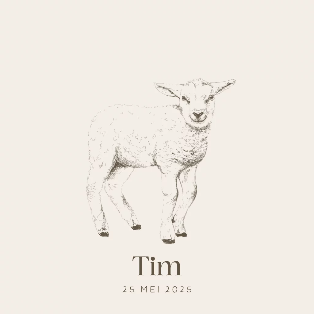 Schattig geboortekaartje met een pentekening van een lief lammetje. Dit gender neutrale geboortekaartje heeft een beige achtergrond. Pas het geboortekaartje naar wens aan en bestel een proefdruk om het geboortekaartje voor jullie kindje in het echt te kunnen bewonderen.