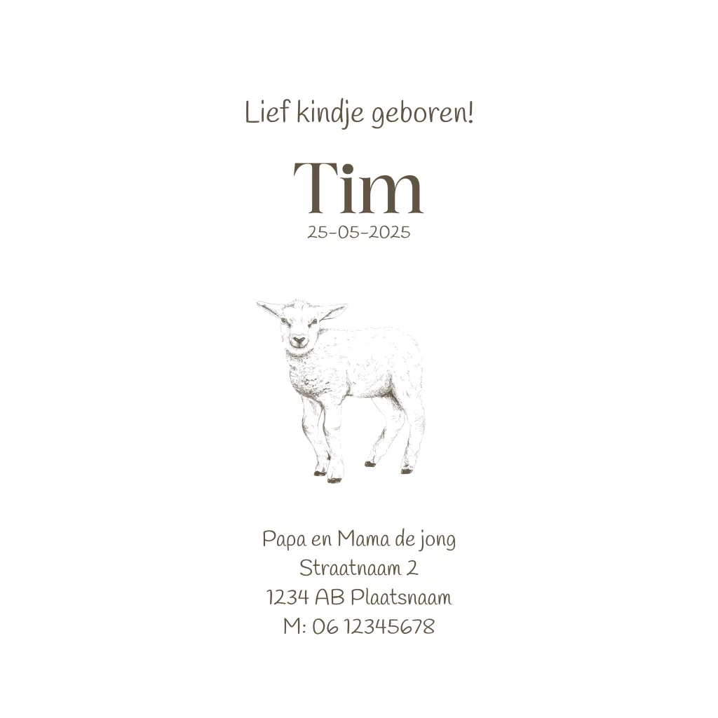 Geboortekaartje neutraal met een dierentekening van een lief lammetje