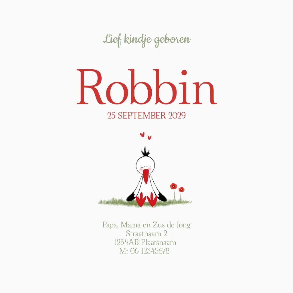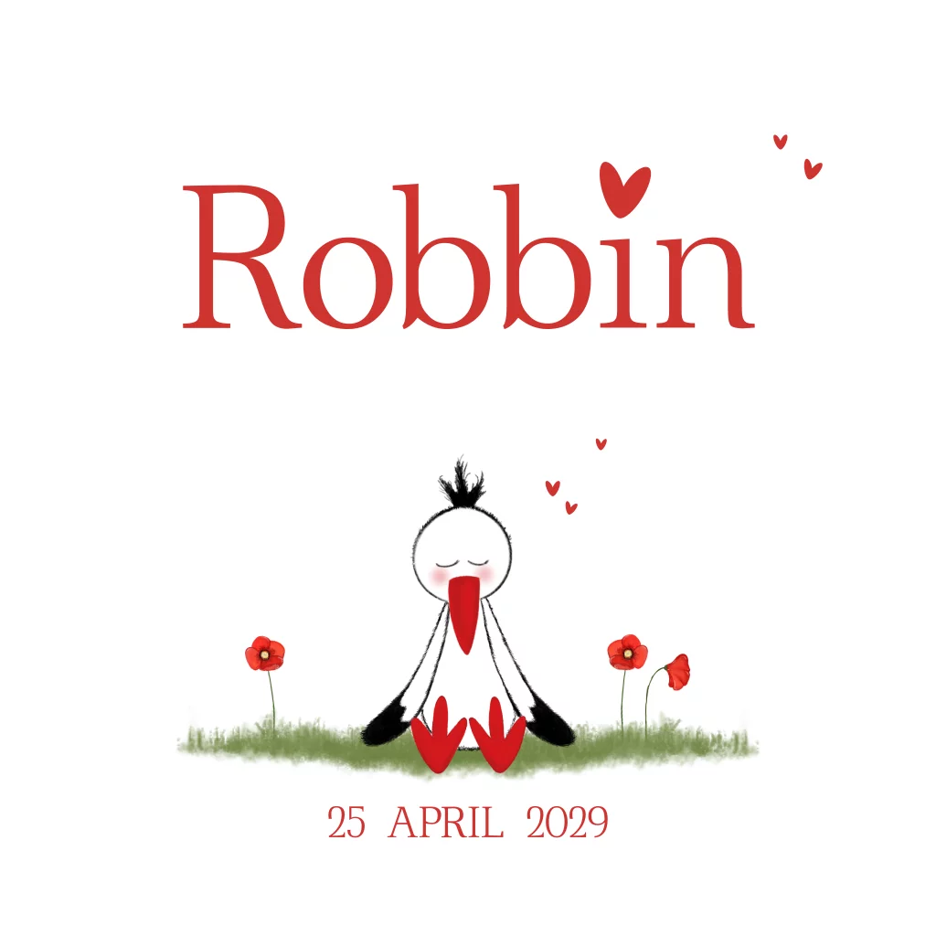 Geboortekaartje ooievaar met klaprozen – Robbin in rood