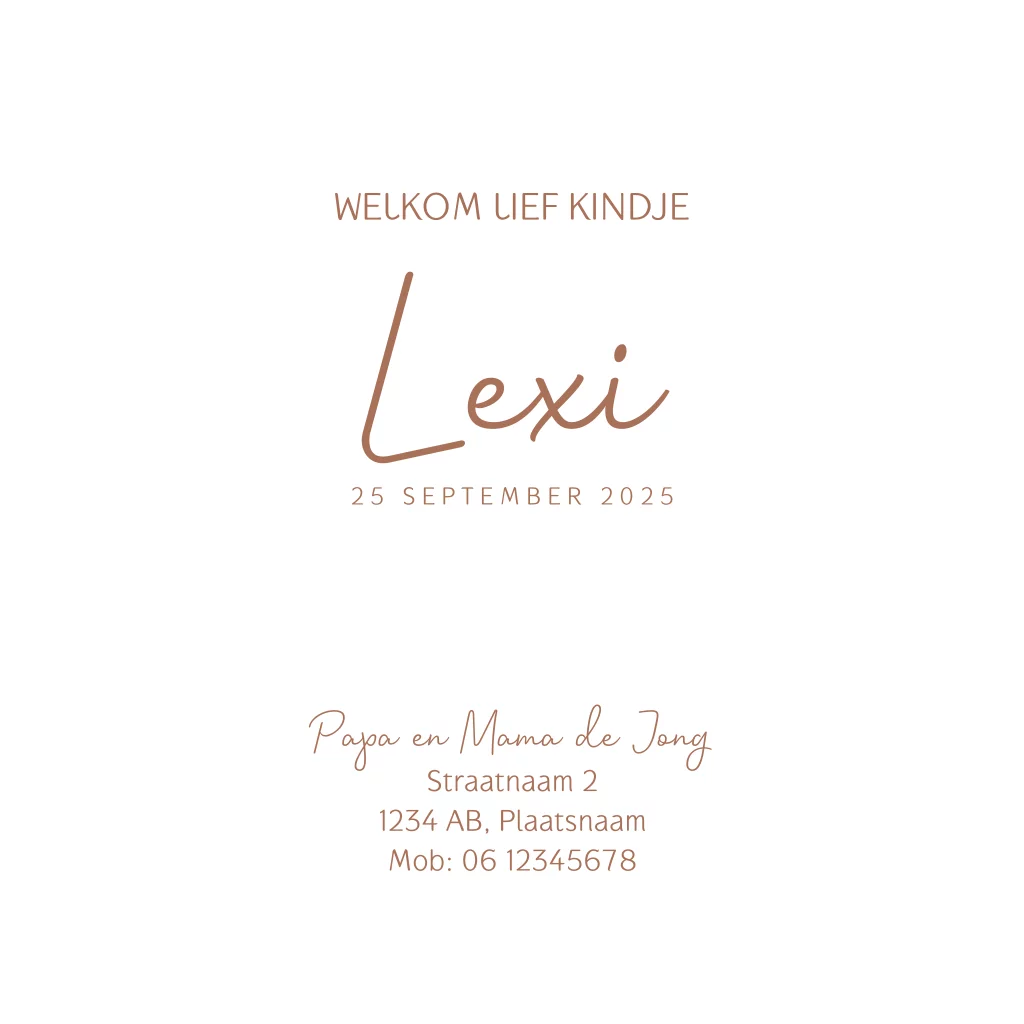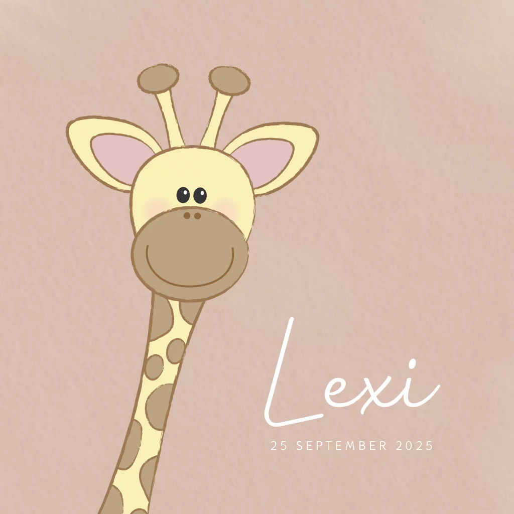 Geboortekaart uniseks met een terra gekleurde reliëf achtergrond en tekeningen van een lief girafje. Dit schattige geboortekaartje pas je gemakkelijk aan in onze handige editor.