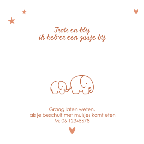 Ontdek ons schattige unisex geboortekaartje, perfect voor de geboorte van een zusje of broertje. Dit koperkleurige kaartje met goudfolie bedrukking heeft een velvet uitstraling en een minimalistisch ontwerp van twee kleine olifantjes met hartjes. Ideaal voor een tweede kindje, maar ook aanpasbaar voor een derde kindje met een afbeelding van drie olifantjes, te vinden bij de "FOLIE DIEREN". Wil je hulp bij het aanpassen van de kaart? Neem gerust contact met ons op, we helpen je graag. De kaart is geheel naar wens aan te passen en een proefdruk bestellen is mogelijk.