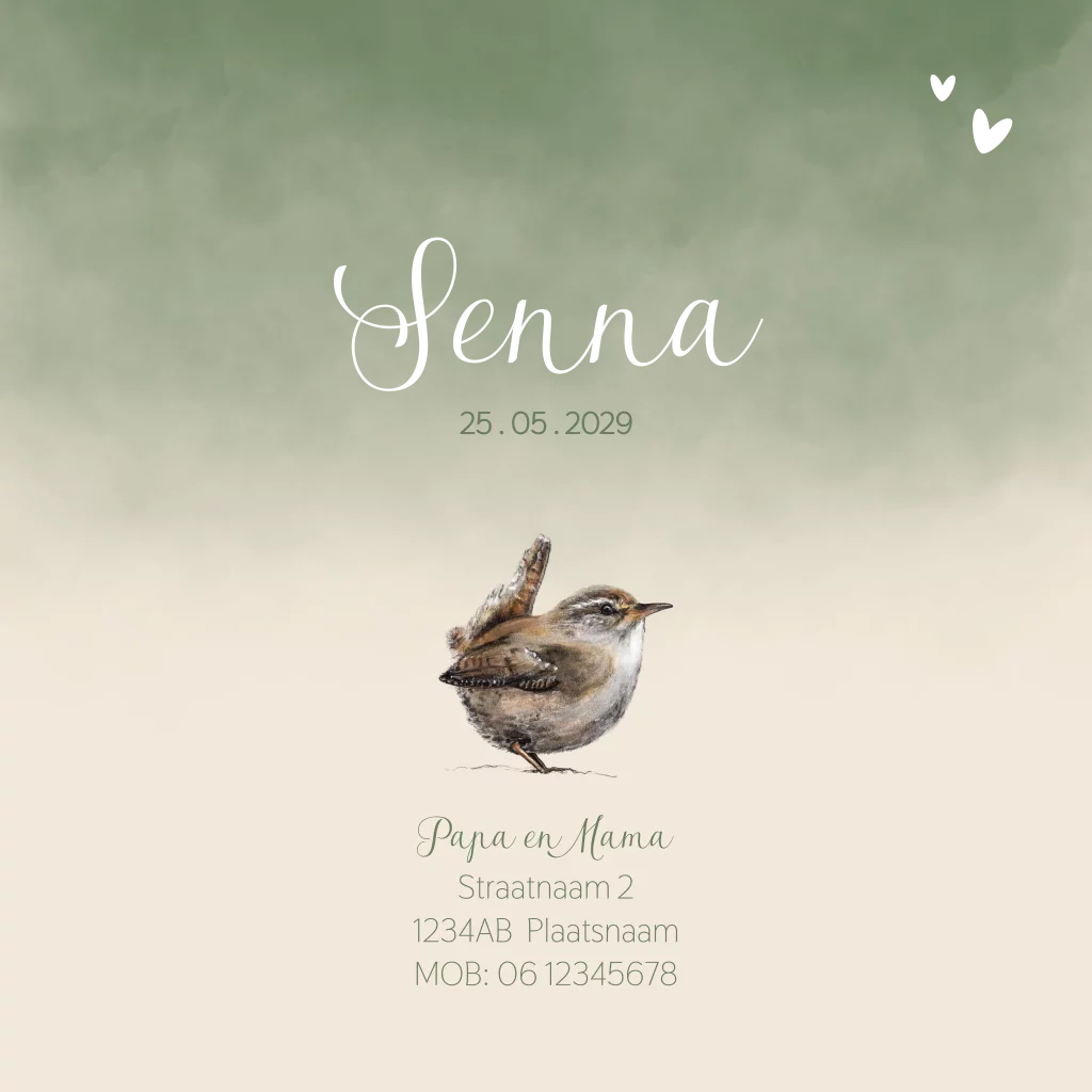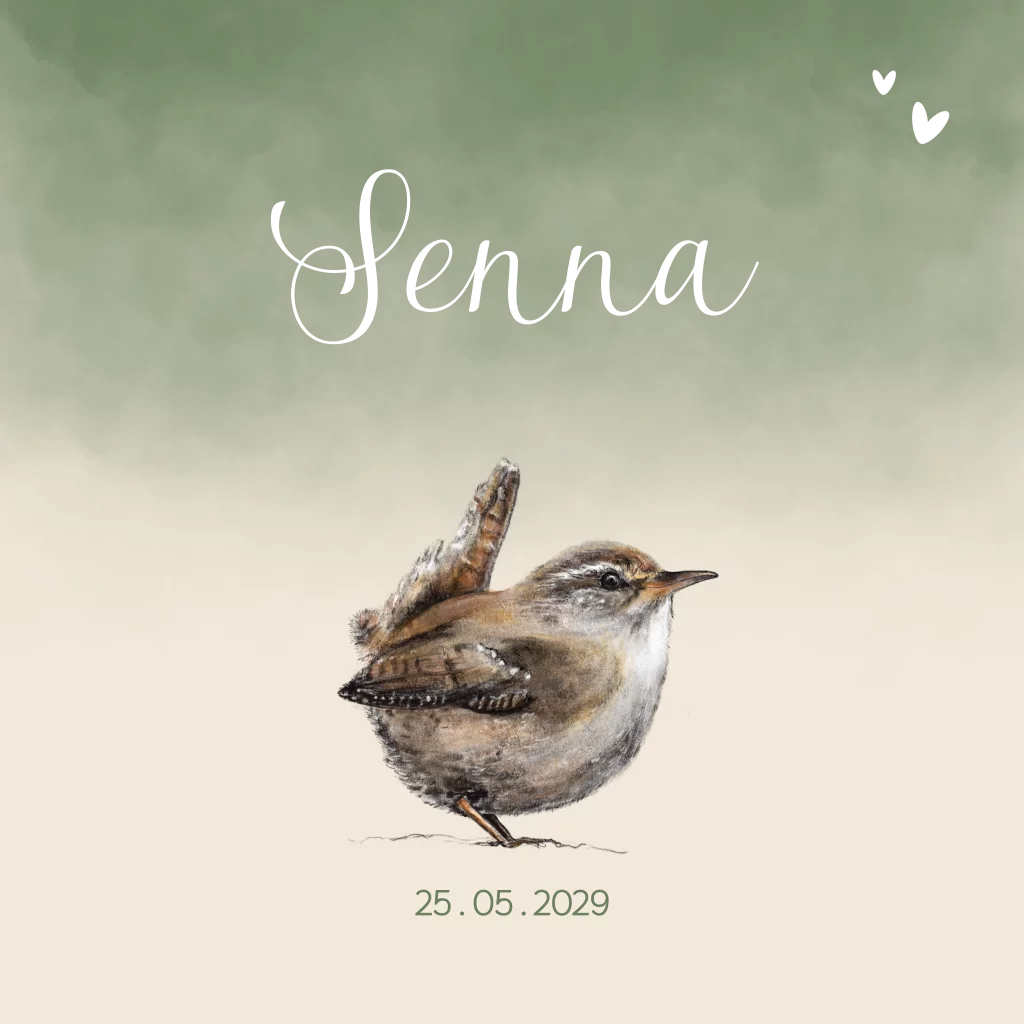 Dit geboortekaartje met een schattig winterkoninkje heeft een rustige en natuurlijke uitstraling. De zachte crème achtergrond en frisse groene accenten maken het ontwerp tijdloos en geschikt voor elk seizoen. Het speelse vogeltje en de subtiele kleuren zorgen voor een warme en verfijnde uitstraling, perfect om de komst van je kleintje aan te kondigen.