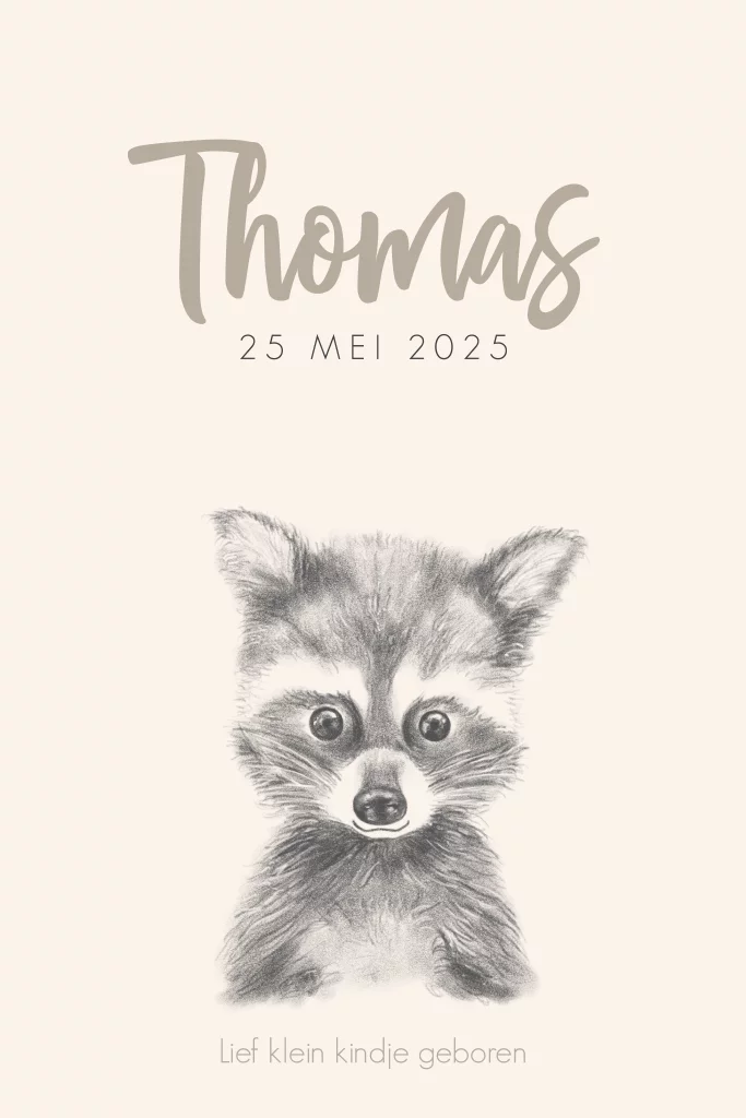 Hip geboortekaartje voor een jongen of meisje met een potloodtekening van een lief wasbeertje. Pas dit schattige geboortekaartje naar wens aan en maak er jullie unieke geboortekaartje van.