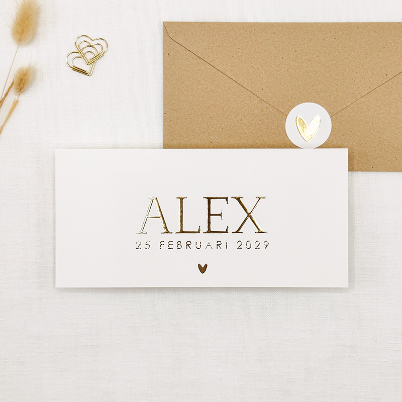 Kaartje Alex heeft een minimalistisch ontwerp waarin de naam van jullie kindje centraal staat — gedrukt in goudfolie op een rustige, witte achtergrond. Het kleine hartje eronder maakt het ontwerp zacht en persoonlijk, zonder dat het te druk wordt.