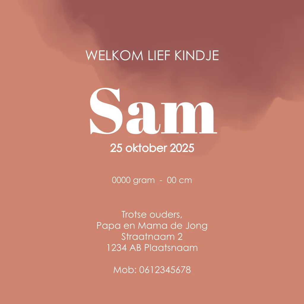 Geef de geboorte van je kindje een warm welkom met onze neutrale geboortekaart met prachtige, warme natuurlijke kleuren. De kaart heeft een verfijnde waterverf look in aarde tinten, waardoor het een minimalistische uitstraling heeft. De herfstkleuren geven een eigentijdse touch aan het ontwerp.