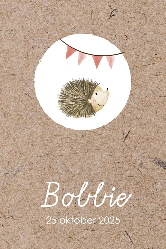 Dit geboortekaartje heeft een kraft-look achtergrond en een tekening van een schattig egeltje met een slingertje.
