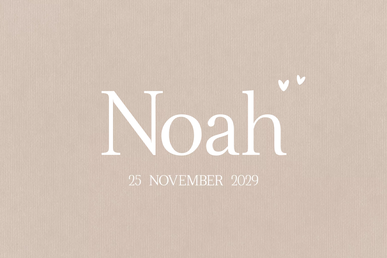 Een minimalistisch geboortekaartje in zachte, natuurlijke tinten met een fijne ribstructuur die doet denken aan een subtiele geweven stof. De liggende kaart heeft ronde hoeken en straalt rust, eenvoud en verfijning uit. In het midden staat de naam van jullie kindje, omringd door twee kleine hartjes in glanzende goudfolie – een stijlvol en liefdevol detail.