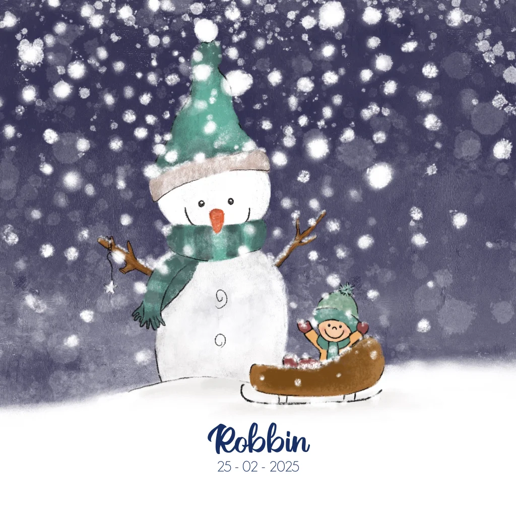Winters geboortekaartje voor jongens en meisjes. Dit unisex geboortekaartje heeft een tekening van een klein kindje in een slee en een sneeuwpop in de sneeuw. De teksten kunnen eenvoudig worden aangepast.