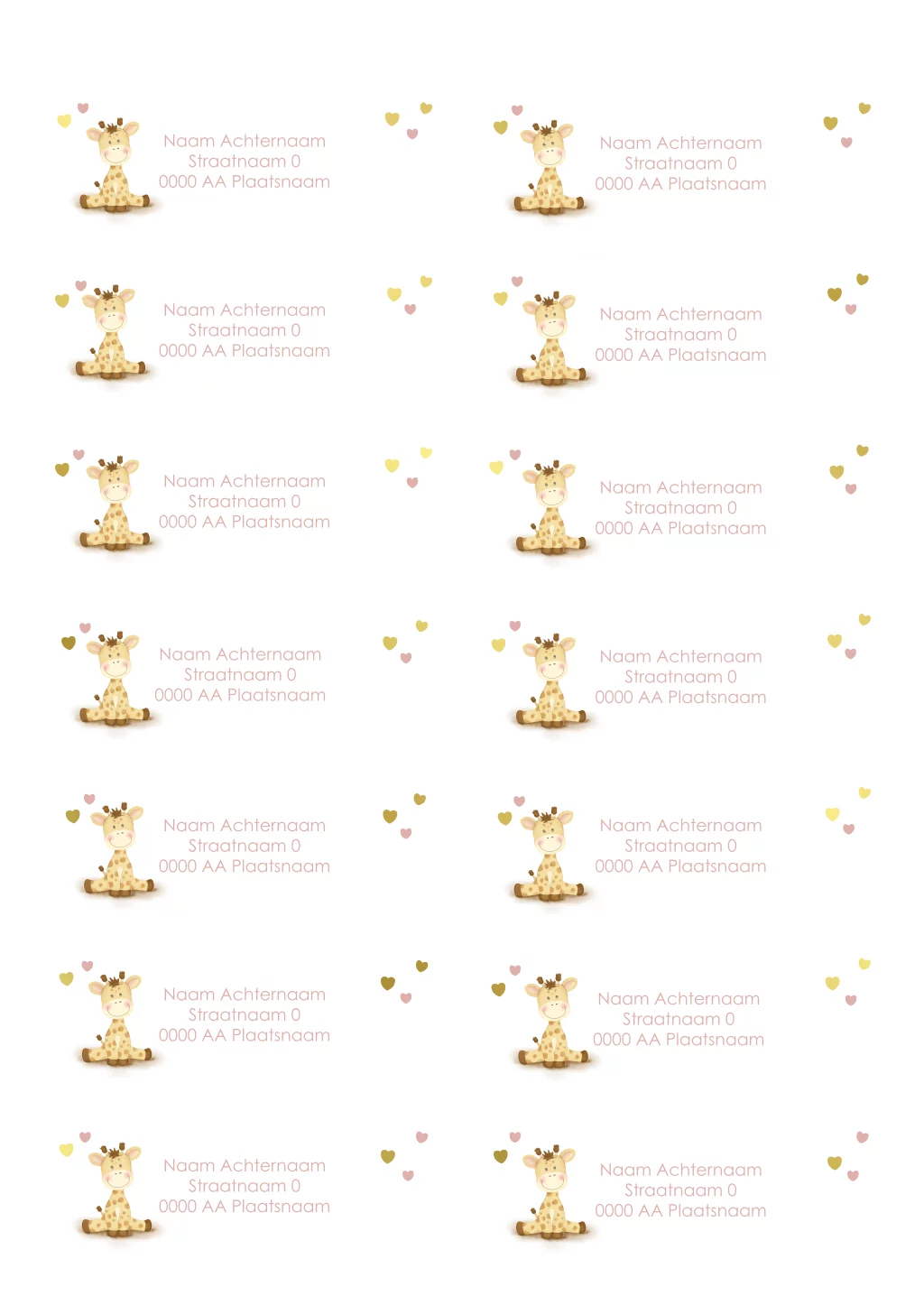 Verzend de geboortekaartjes van jullie dochter in stijl met een mooie adressticker op de envelop in dezelfde stijl van het geboortekaartje. Deze adressticker heeft een tekening van een schattig girafje en goudfolie hartjes en een sterretje als extra versiering.