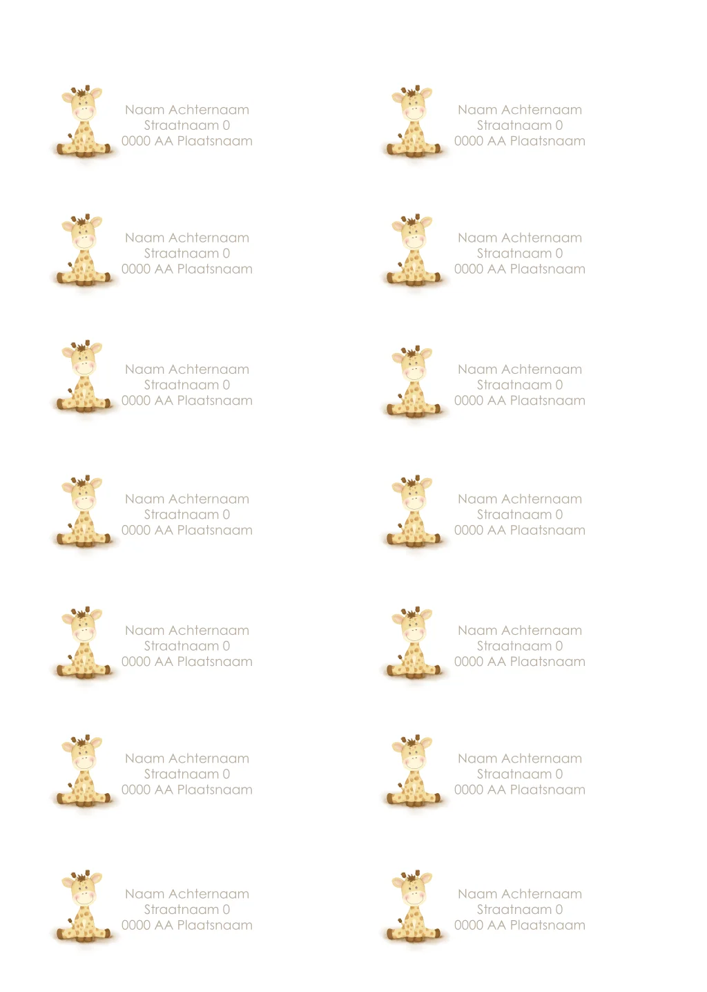 Verzend de geboortekaartjes van jullie in stijl met een mooie adressticker op de envelop in dezelfde stijl van het geboortekaartje. Deze adressticker heeft een tekening van een schattig girafje. de voorbeeldadressen kunnen eenvoudig worden aangepast naar jullie eigen gegevens.