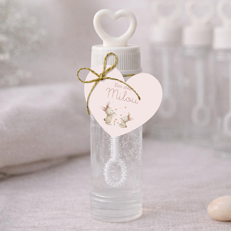 Het label is eenvoudig te bevestigen aan zakjes, flesjes of andere kraambedankjes en kan volledig worden gepersonaliseerd met naam en tekst in de editor. De bellenblaas op de foto is als voorbeeld en wordt niet meegeleverd.