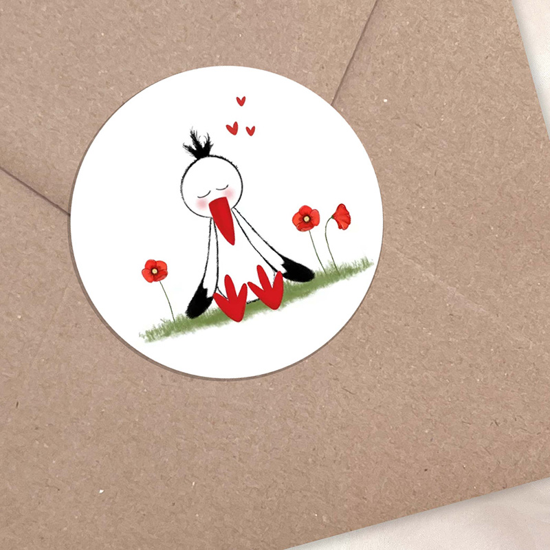 Ronde sticker ooievaar en klaprozen – sluitzegel geboorte of bedankje