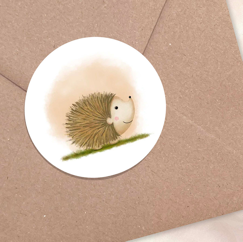 Hoe lief is dit egeltje? Deze ronde sticker is perfect als sluitzegel voor een envelop, doopsuiker of traktatie. Het zachte ontwerp met warme tinten past prachtig bij geboortekaartjes met een dierenthema of bij een neutrale babykamerstijl.