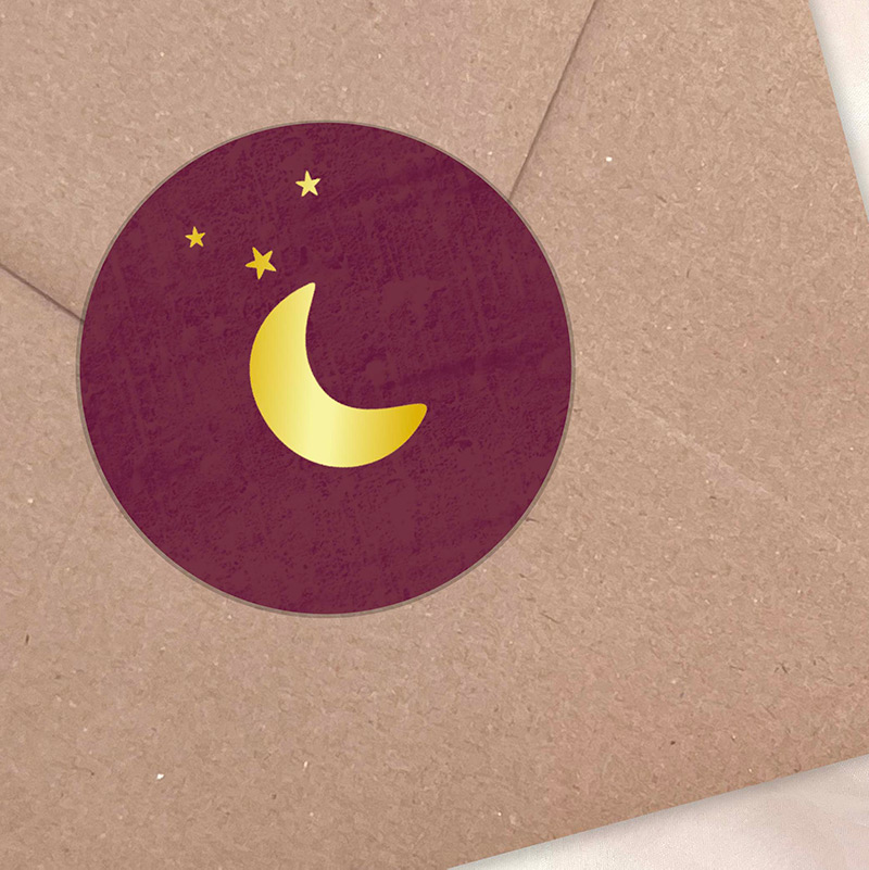 Een stijlvolle ronde sluitsticker met een gouden maantje en drie sterretjes op een diepe bordeaux achtergrond.