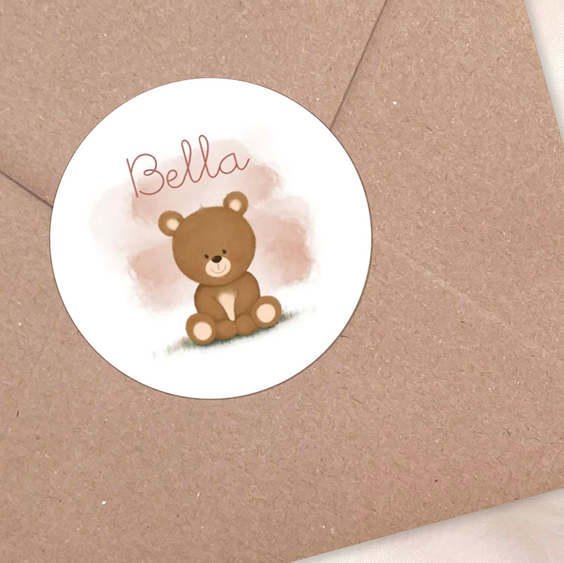 Hoe lief is dit beertje? Deze ronde sluitsticker is perfect als finishing touch op een envelop, doopsuiker of traktatie. De zachte aquarelachtergrond en de naam Bella maken deze sticker extra persoonlijk en volledig in stijl met het bijpassende geboortekaartje.