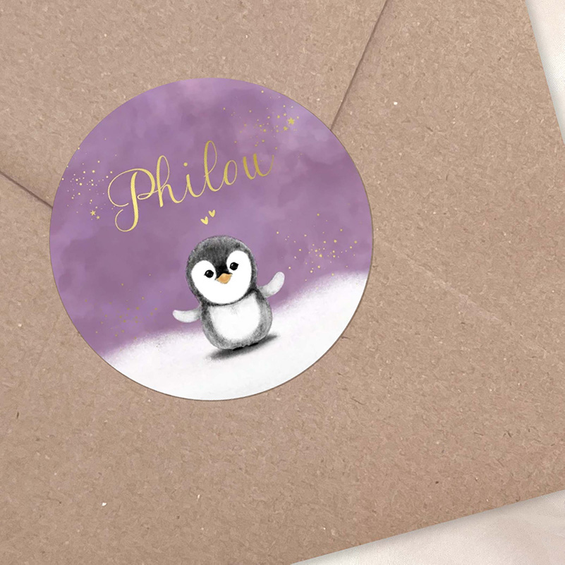 Maak het versturen van jullie geboortekaartjes extra bijzonder met deze winterse sluitsticker. De schattige pinguïn staat vrolijk in de sneeuw, terwijl de naam van jullie kindje schittert in goudfolie tegen een zachte paarse achtergrond. Perfect om enveloppen feestelijk af te sluiten en ook leuk voor doopsuiker, traktaties of kleine cadeautjes.