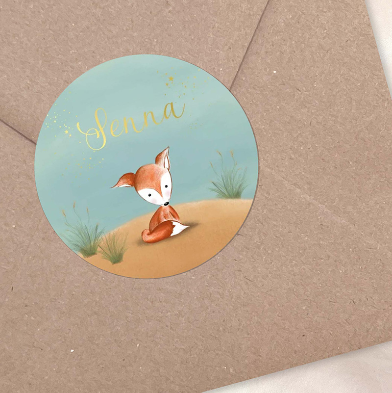 Sluitsticker geboortekaartje vosje – met naam en goudfolie
