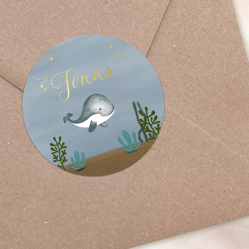 Tip: deze sluitsticker matcht perfect met het geboortekaartje met walvis en goudfolie .