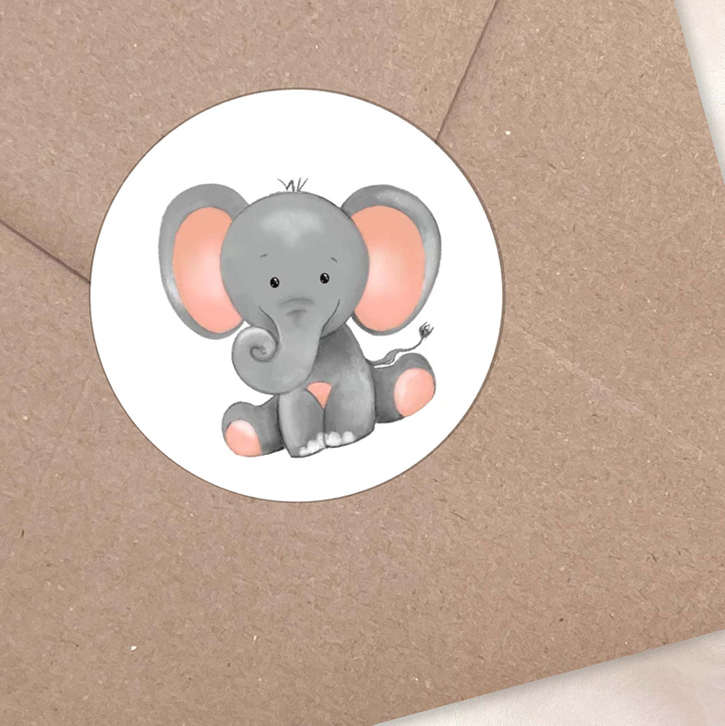 Hoe schattig is dit olifantje? Deze ronde sticker is perfect als sluitzegel voor een envelop, doopsuiker of traktatie. De warme grijstinten en zachte roze accenten maken hem ideaal voor geboortekaartjes met dierenthema of een neutrale babykamerstijl.