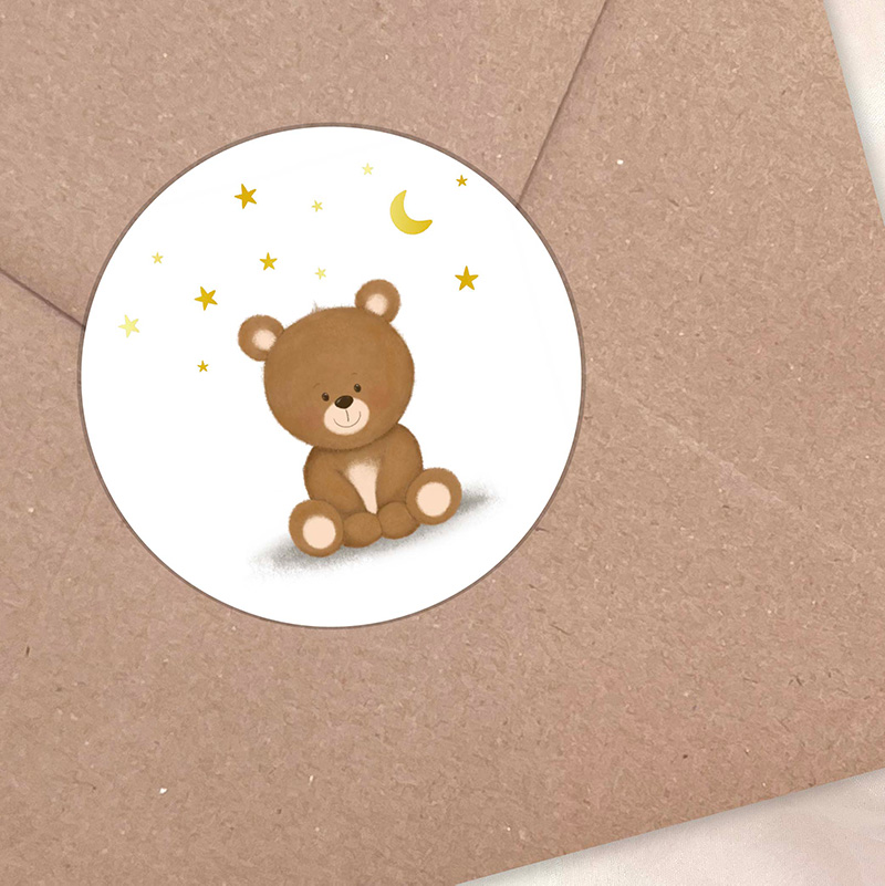 Deze lieve ronde sticker met het beertje uit kaartje Balou is een perfecte match voor jullie geboortekaartje! De illustratie met het bruine beertje onder een hemel vol sterretjes en een maantje zorgt voor een dromerige sfeer en is ideaal als sluitzegel of versiering van een traktatie of doopsuikerzakje.
