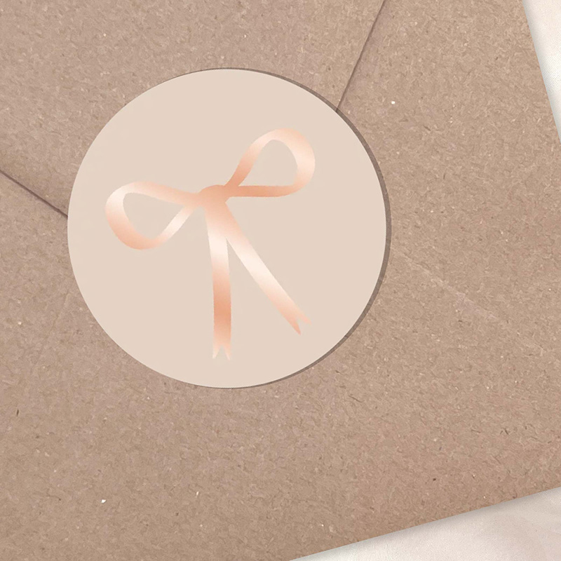 Een elegant peachkleurig strikje in roségoud-look, perfect afgestemd op het geboortekaartje van Amalia. Deze stijlvolle sluitsticker geeft een extra feestelijk accent aan een envelop, bedankje of traktatie.