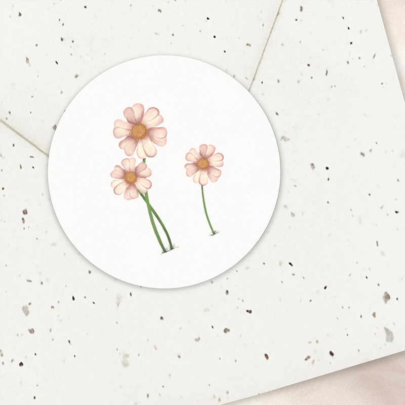 Deze ronde stickers met zachte bloemen hebben een lichte, rustige uitstraling in warme, zachte tinten. De handgetekende illustratie zorgt voor een tijdloze en neutrale look.