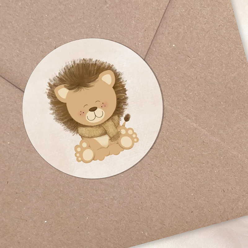 Deze ronde stickers met een lief leeuwtje hebben een warme, zachte uitstraling in beige tinten. De handgetekende illustratie zorgt voor een rustige en tijdloze look. Perfect te gebruiken als sluitsticker voor geboortepost, enveloppen of kleine bedankjes.