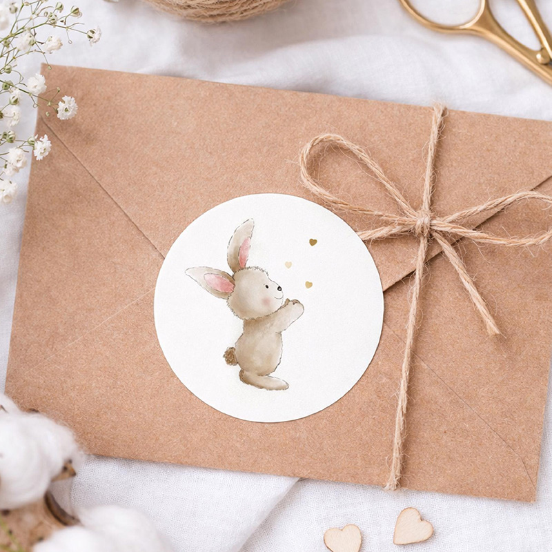 Deze ronde stickers met een lief konijntje en kleine hartjes hebben een zachte, warme uitstraling. De handgetekende illustratie zorgt voor een rustige en tijdloze look.