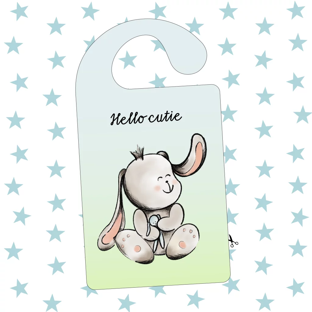 Felicitatie geboorte zoon. Lieve, DIY kaart met blauwe sterren en een uit te knippen deurhanger met een tekening van een lief konijntje.