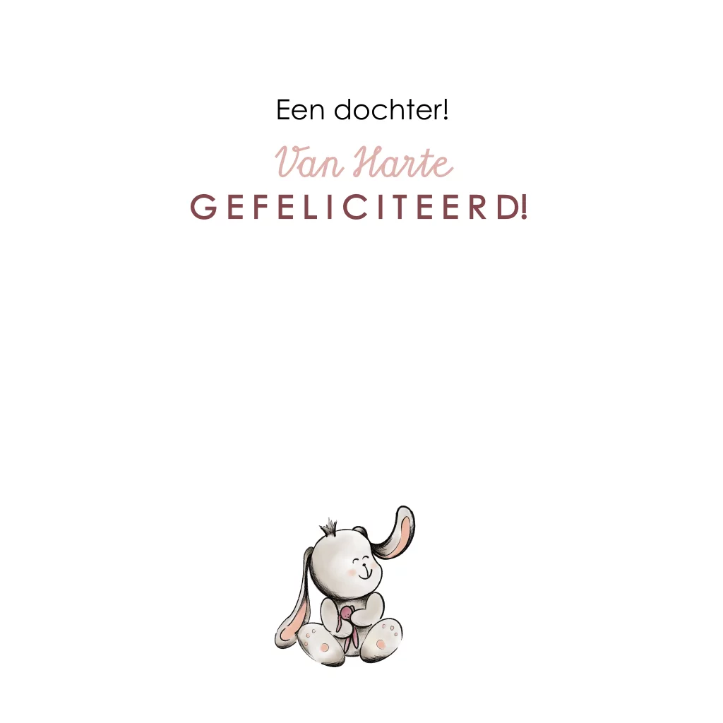 Felicitatie geboorte meisje. Lieve, DIY kaart met roze sterren en een uit te knippen deurhanger met een tekening van een lief konijntje.