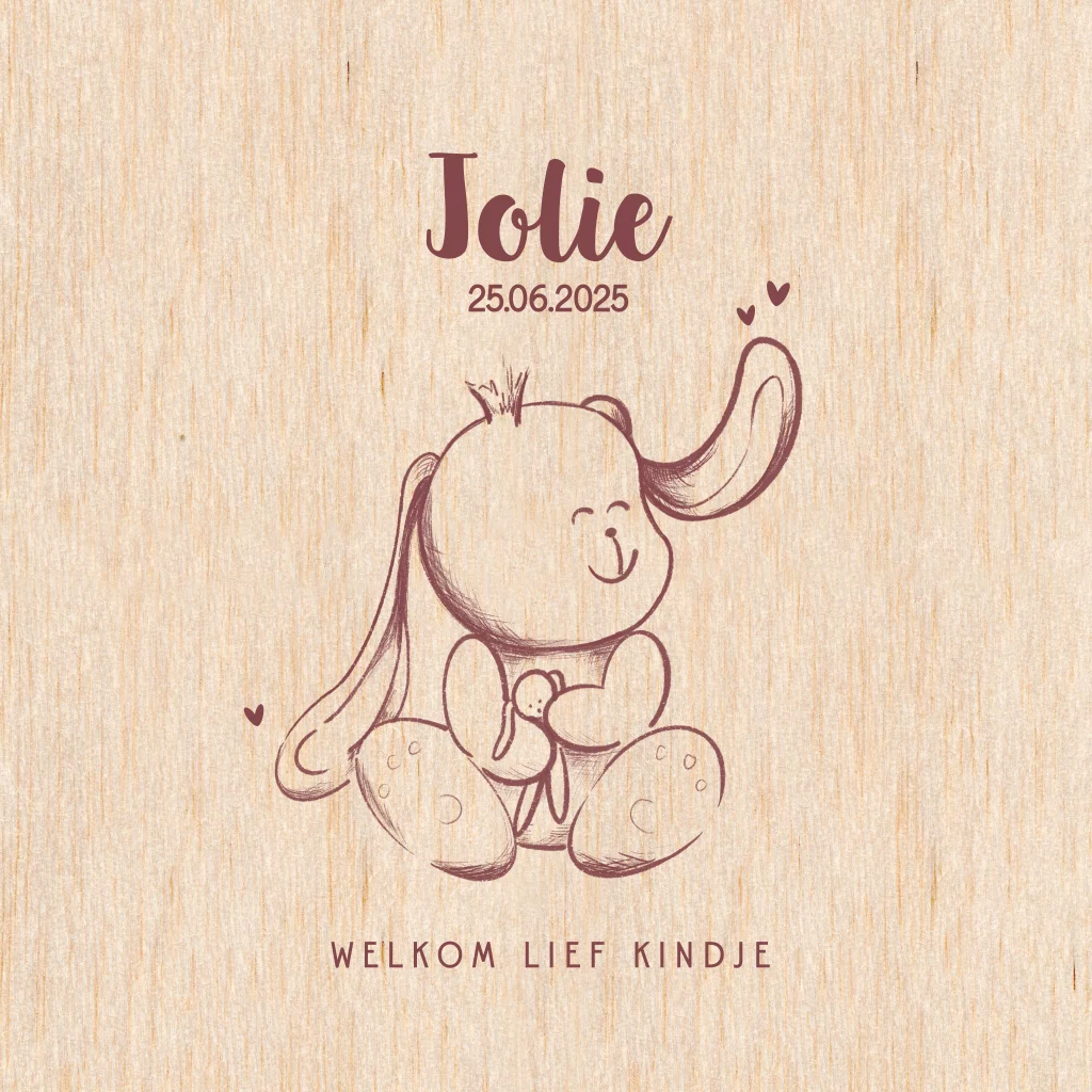 Geboortekaartje van echt hout. Deze geboortekaart heeft een tekening van een lief konijntje. Deze kaart kan eenvoudig worden aangepast. Je kunt ook de kleur van dit schattige konijntje zelf aanpassen.