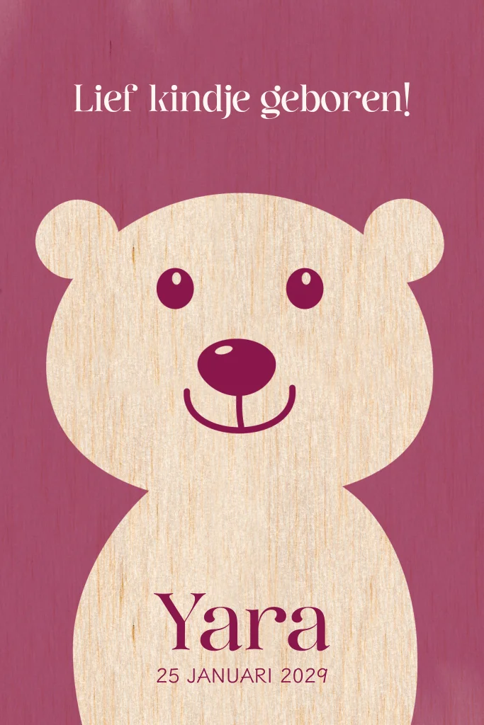 Dit unieke geboortekaartje van hout heeft een lieve illustratie van een schattig ijsbeertje en warme paars-roze-rode tinten, perfect om de geboorte van jullie kleintje op een bijzondere manier aan te kondigen. Het natuurlijke houtpatroon zorgt voor een authentieke en rustieke uitstraling, terwijl je de kaart volledig naar wens kunt personaliseren. Let op: bij deze houten kaart wordt geen witte inkt gedrukt, waardoor witte delen het natuurlijke hout zichtbaar laten. Bestel eenvoudig een proefdruk om de kwaliteit en het ontwerp zelf te ervaren.