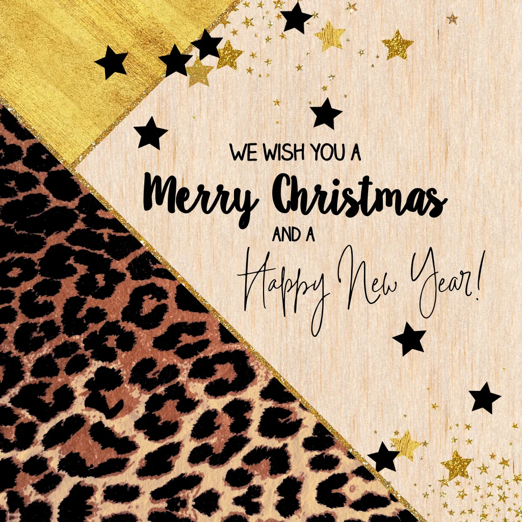 Breng een vleugje moderne elegantie in je kerstgroeten met onze exclusieve Kerstkaart van echt hout. Deze trendy en originele kaart is gedurfd versierd met een stoere panterprint en sprankelende goudkleurige en zwarte sterren, waardoor het een feestelijke blikvanger wordt. Jouw kans om een unieke kerstkaart te creëren! Pas de kaart naar wens aan, voeg je eigen persoonlijke touch toe en maak een meesterwerk dat de ontvangers zal betoveren. Wil je de kwaliteit van het hout zelf ervaren? Bestel dan een proefdruk en voel de magie van de feestdagen alvast in je handen. Maak dit seizoen speciaal met jouw gepersonaliseerde houten kerstkaart.
