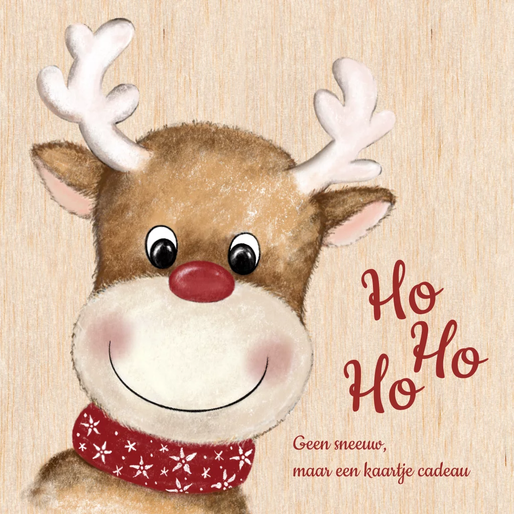 Stuur een unieke kerstgroet met deze luxe houten kerstkaart, gemaakt van echt berkenhout! De kaart heeft een vrolijke en grappige tekening van een rendier, perfect om een glimlach op ieders gezicht te toveren. Je kunt de tekst op de kaart naar wens aanpassen om jouw persoonlijke kerstboodschap toe te voegen.