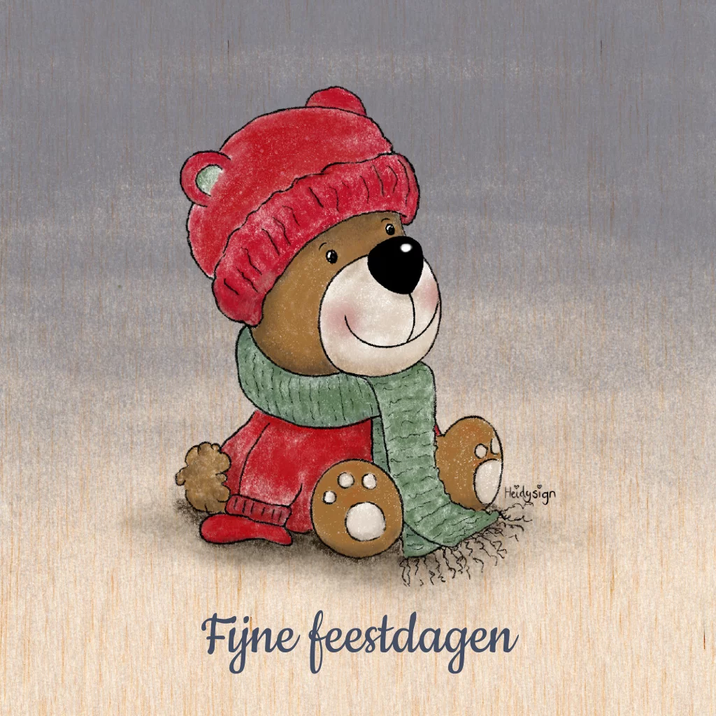 Houten kerstkaart met schattig beertje in een winterse outfit
