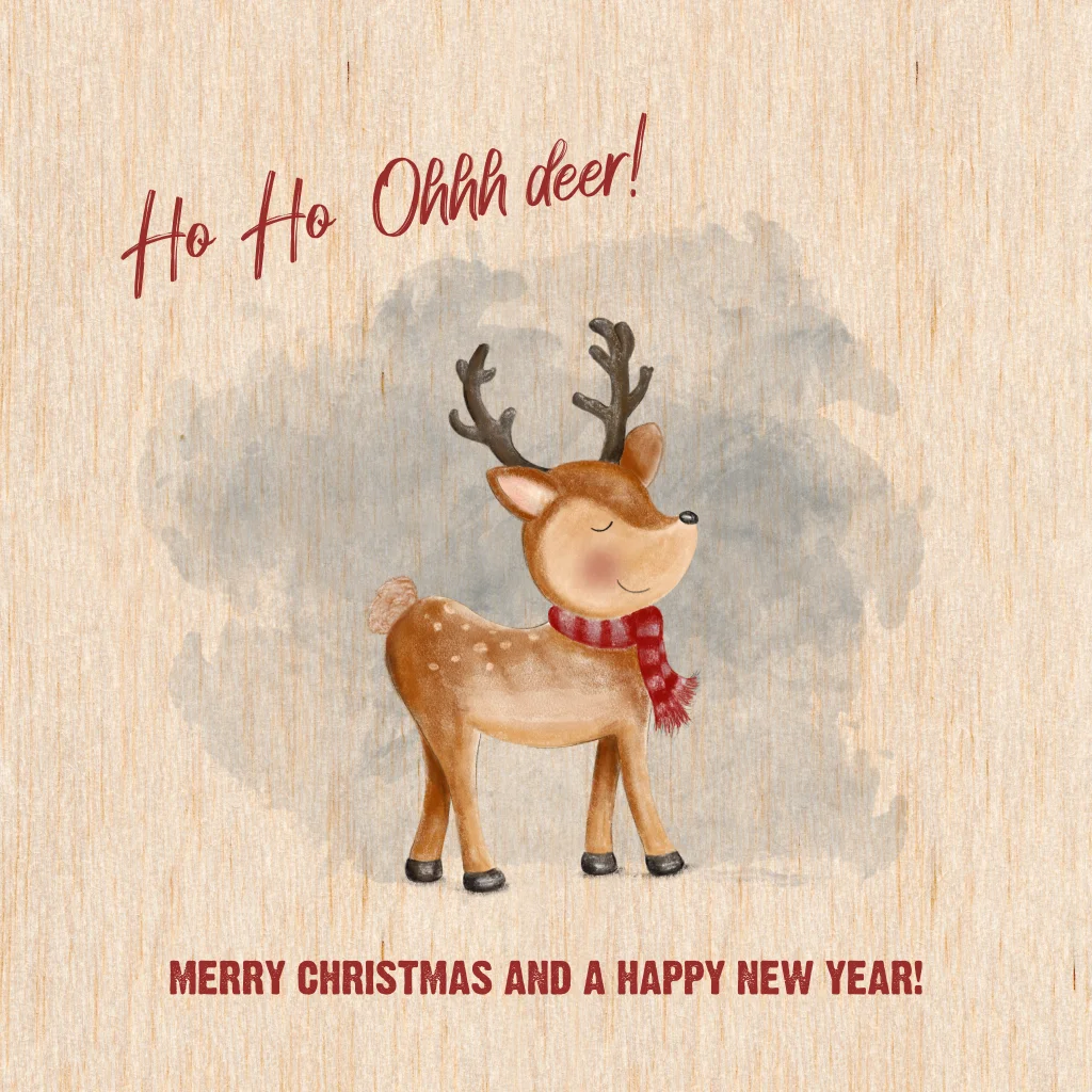 Houten kerstkaart met een schattig rendiertje en sjaaltje