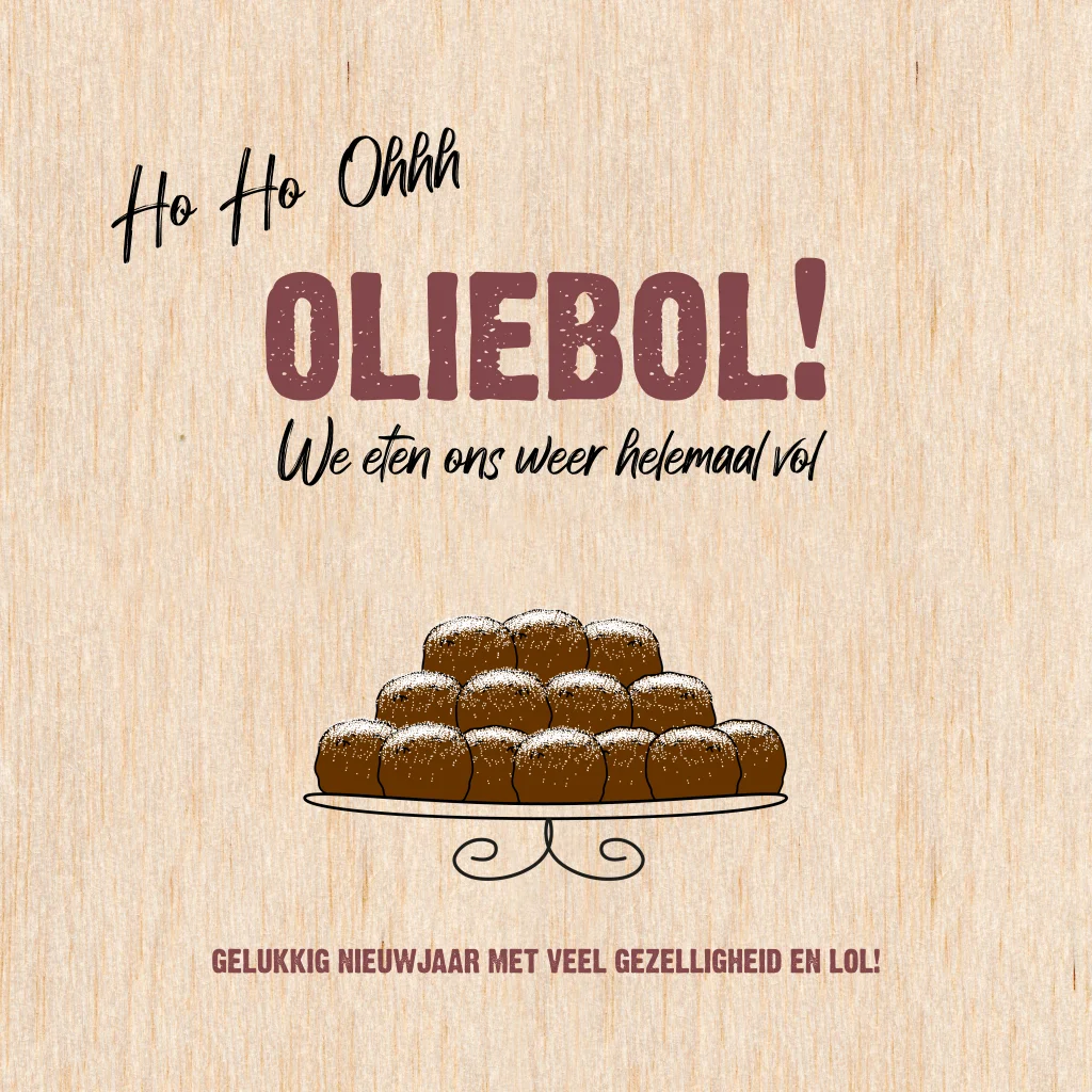 Laat iedereen lachen met deze originele houten nieuwjaarskaart, gedrukt op echt berkenhout, met een vrolijke illustratie van oliebollen en de humoristische tekst: "Ho Ho Ohhhh Oliebol, we eten ons weer helemaal vol!" Perfect voor iedereen die dol is op humor tijdens de feestdagen! Je kunt de kaart naar wens aanpassen en jouw eigen grappige kerstwens toevoegen.