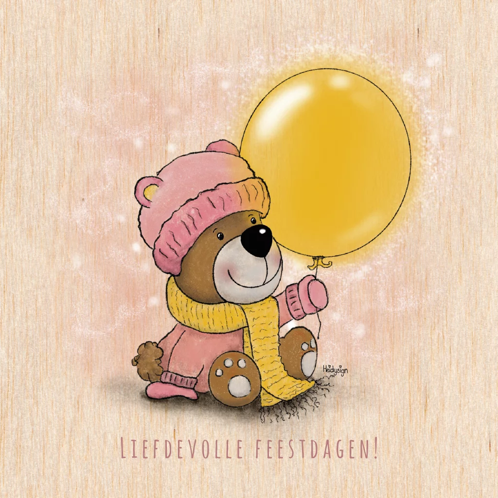 Verspreid warmte en magie deze kerst met onze unieke houten kerstkaart! Het beertje met zijn schattige roze muts en betoverende gele ballon brengt een glimlach op ieders gezicht.