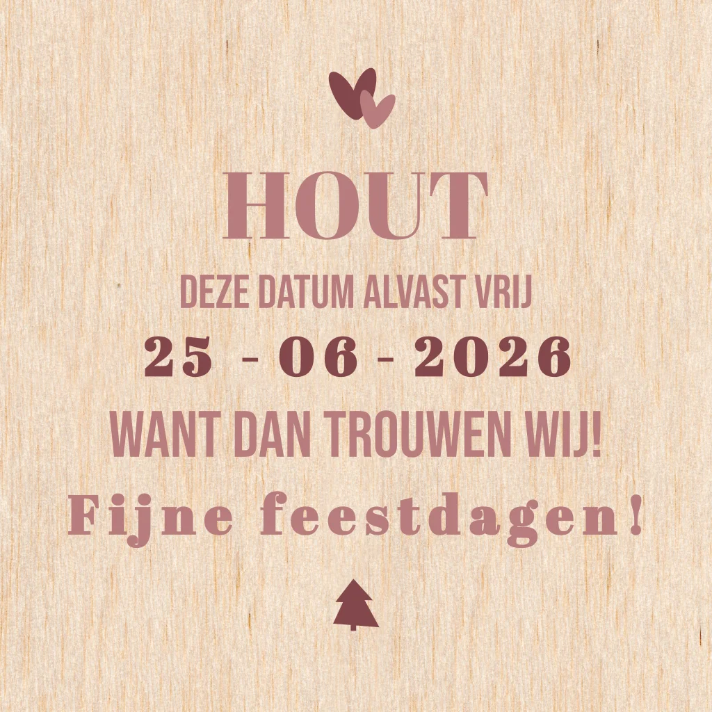 Maak deze kerst extra bijzonder met onze unieke Save the Date kaart van echt hout. Met een speels woordgrapje, "HOUT deze datum alvast vrij," voeg je een vleugje humor toe aan jullie aankondiging.