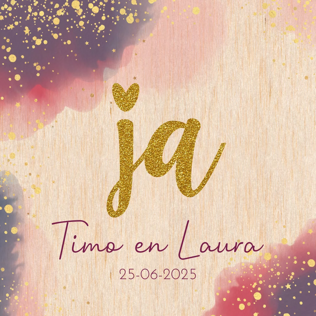 Deze hippe trouwkaart van echt hout met waterverf-print kun je eenvoudig naar wens aanpassen. Het woord "Ja" met een hartje in goudkleurige glitter print, kun je verwijderen of vervangen.